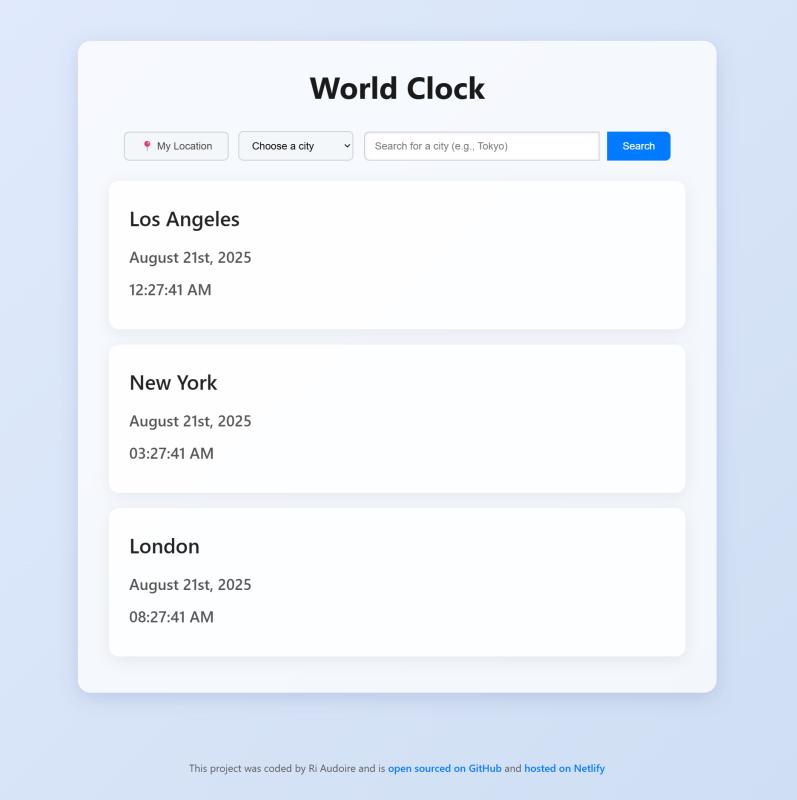 A world clock I built as part of the SheCodes Advanced Web Development Add-On — a responsive and accessible web application that displays the current time and date across multiple global time zones including the user's location.