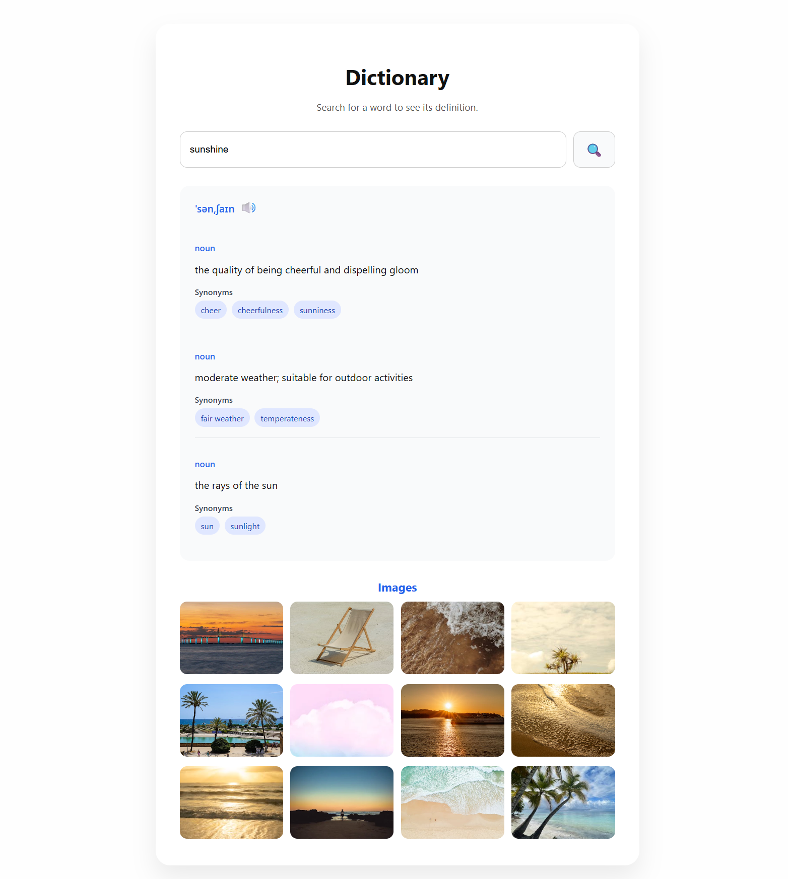 I built a responsive dictionary web application using React that allows users to search for words and instantly view definitions, phonetics, pronunciation audio, synonyms, and related imagery.