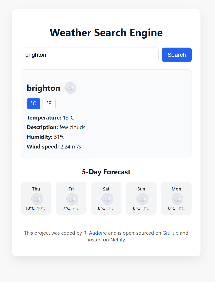 Learn moreA responsive and interactive weather application built with React.js that allows users to search for any city worldwide and view current weather conditions along with a 5-day forecast.